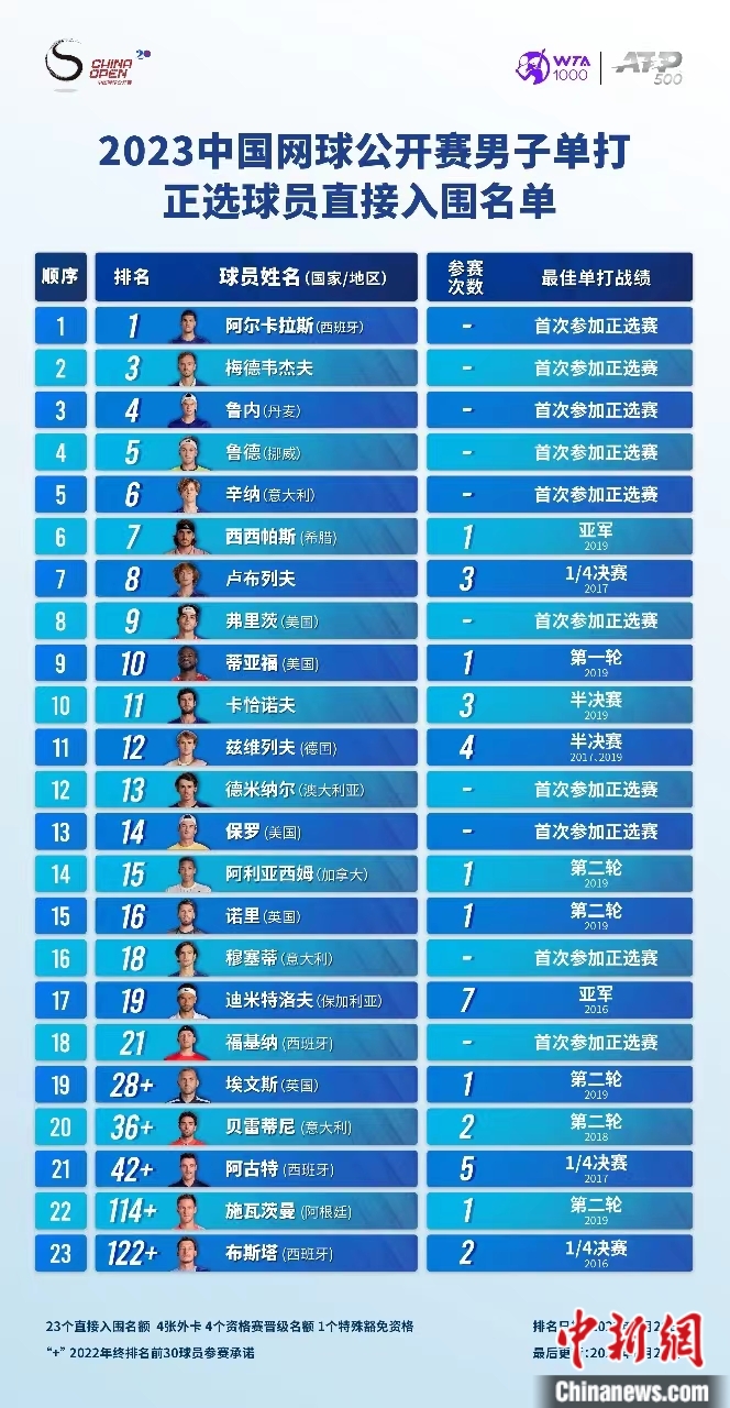 2023中网正式公布男子正赛名单:全球前十中九人